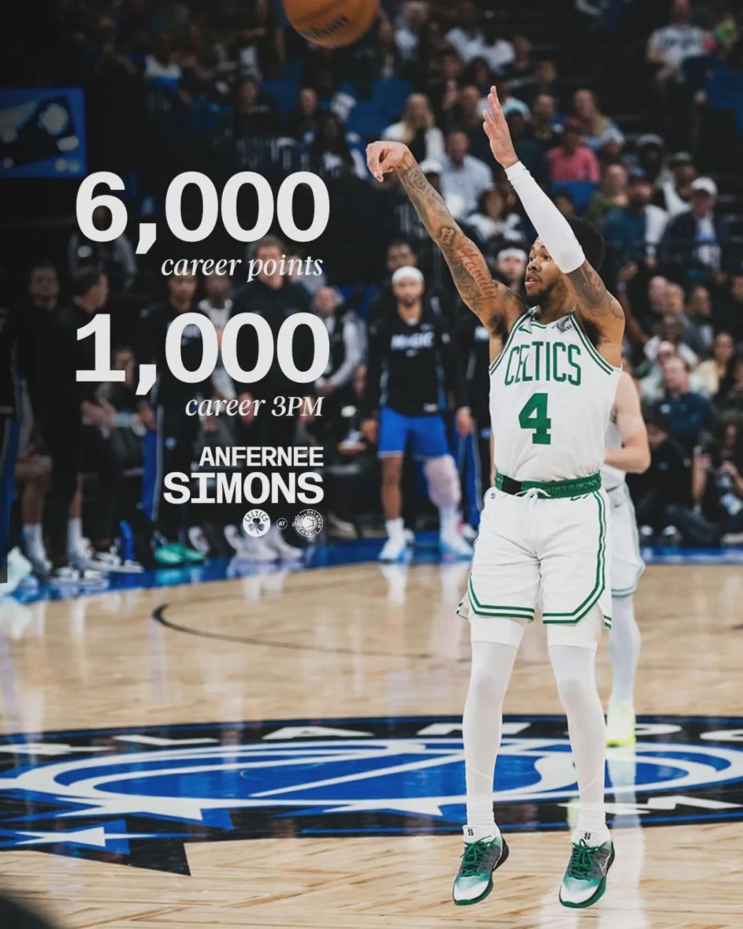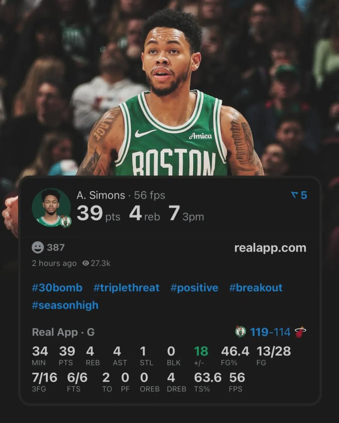 凯尔特人119-114战胜热火,完成19分大逆转。凯尔特人后卫安芬尼-西蒙斯替补出战34分钟,投篮28中13,三分16中7,罚球6中6,爆砍39分4篮板4助攻1抢断,正负值+18全场第二高!得分创造个人赛季新高,此前纪录只有27分。